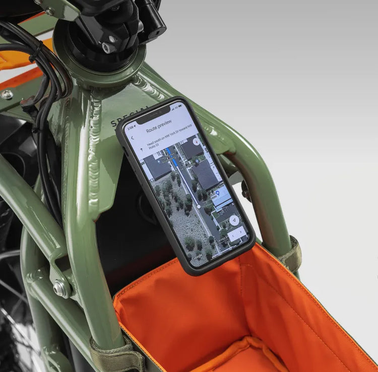The mechanically locking and magnetic vibration dampening Peak Design phone mount enables phone protection and one handed phone attachment and removal.